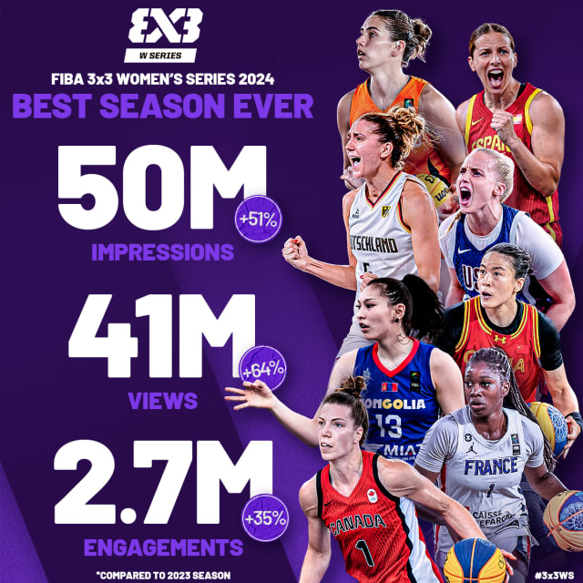 Over the course of the 2024 season, which featured 20 stops culminating in the Final, the FIBA 3x3 Women's Series drew 50 million impressions across its digital platforms, a 51% increase compared to the previous year. Moreover, the Women’s Series recorded 41 million views in 2024, a 64% increase from 2023. This growth in viewership highlights the exciting nature of the fast-paced 3x3 format and the world class talent on display in the Women's Series.